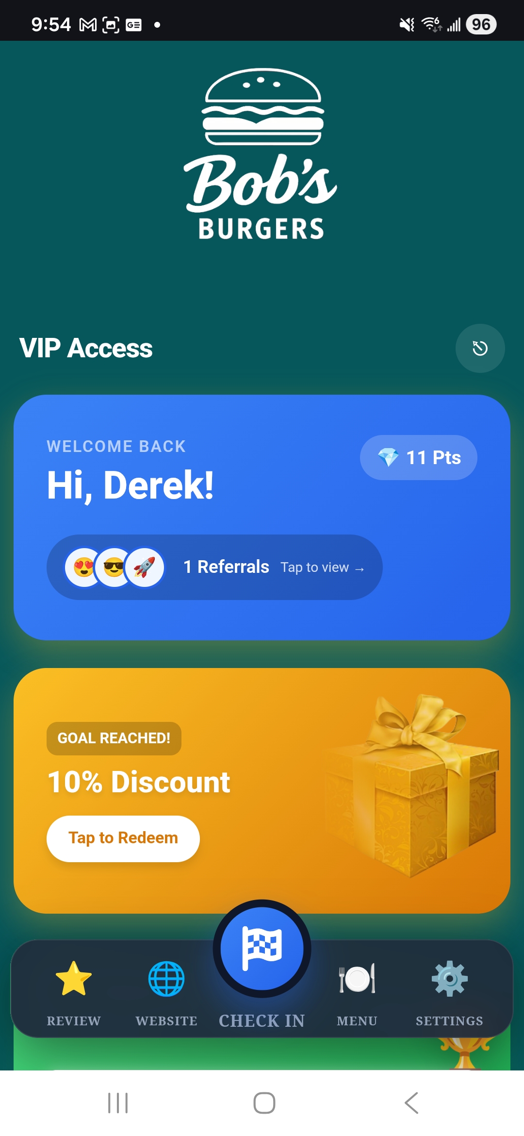 Branded User Dashboard for Point rewards, referrals, and check-ins